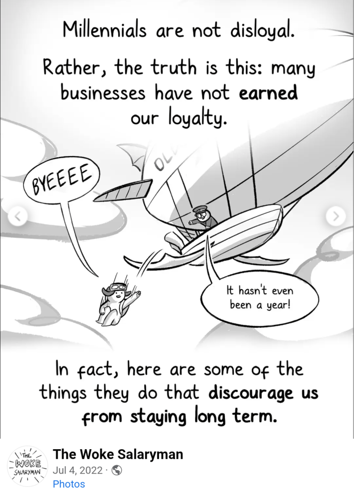 In my experience, I’ve had a number of older people express dismay that young folks have no more loyalty to their employer. (This is usually in the context of the tech industry and adjacent fields.) My rebuttal to this is usually that my generation saw our parents laid off from companies they’d poured their lives into, so it’s hard to feel loyalty to a company that doesn’t care about you.